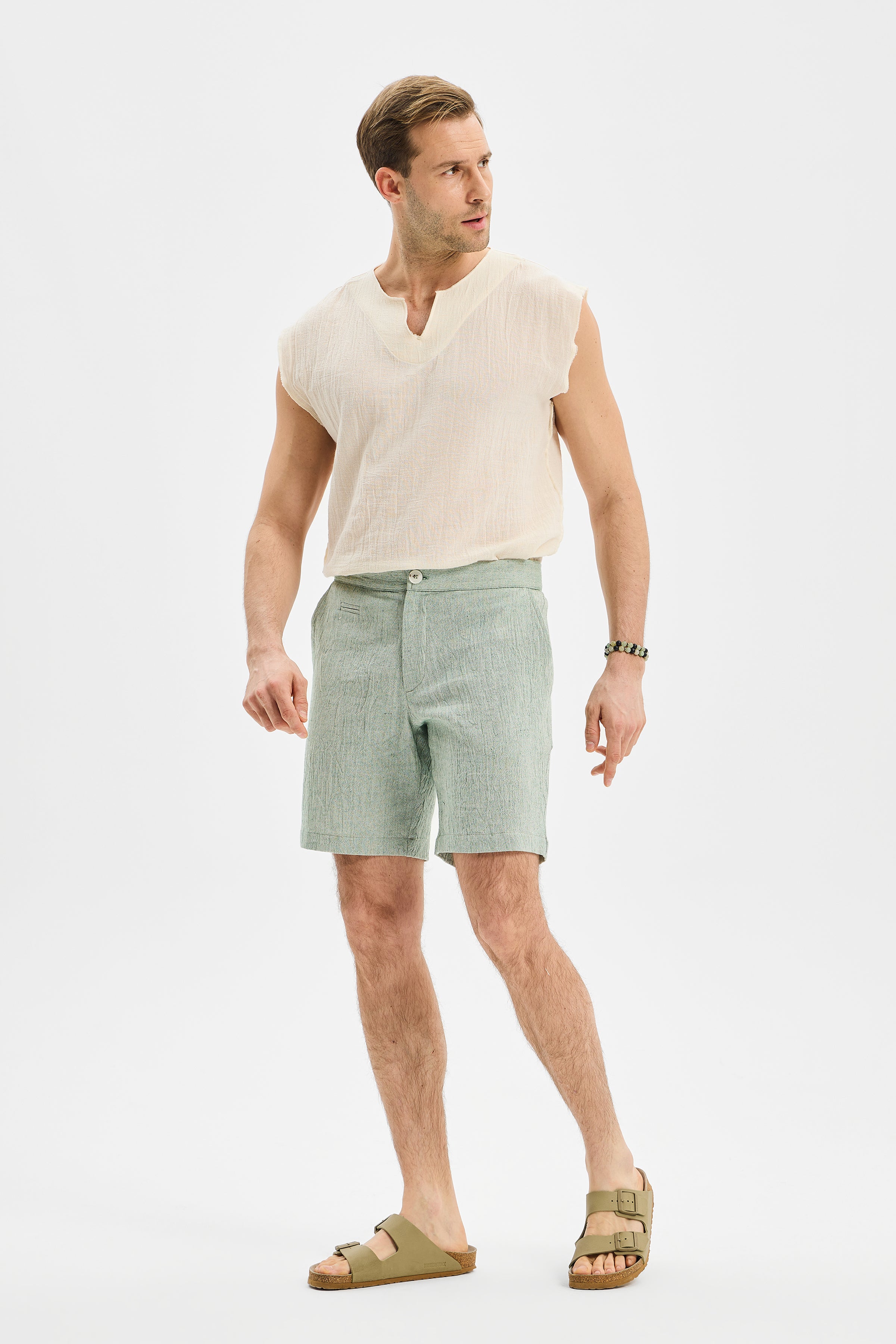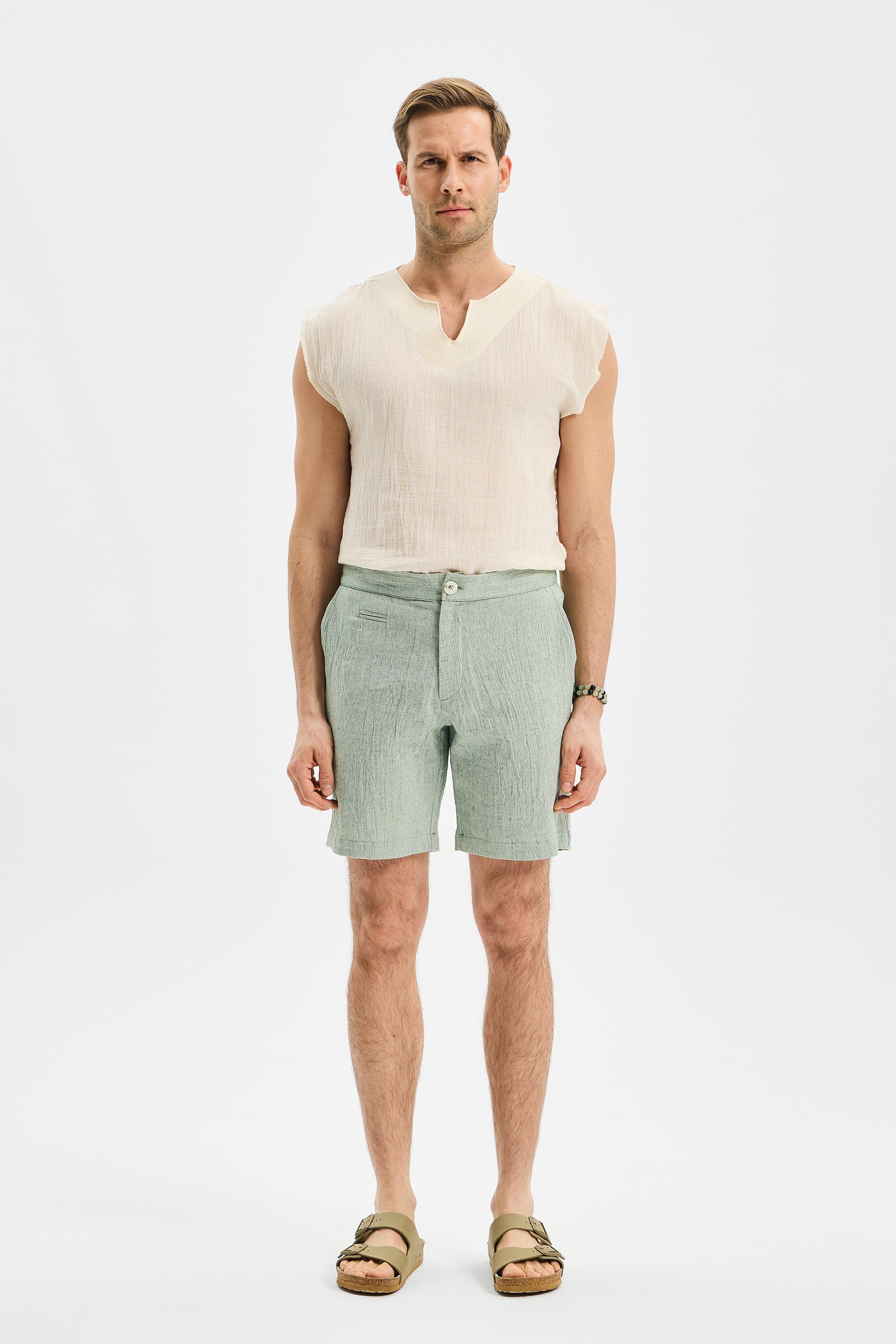 DRIFTpresents a timeless interpretation of the men’s short silhouette through clean lines and relaxed proportions. Falling just above the knee, its clear length and easy structure offer freedom of movement and effortless comfort throughout the day. The minimalist cut allows the piece to transition naturally between home wear and refined summer city styling, acting as a quiet yet essential foundation.