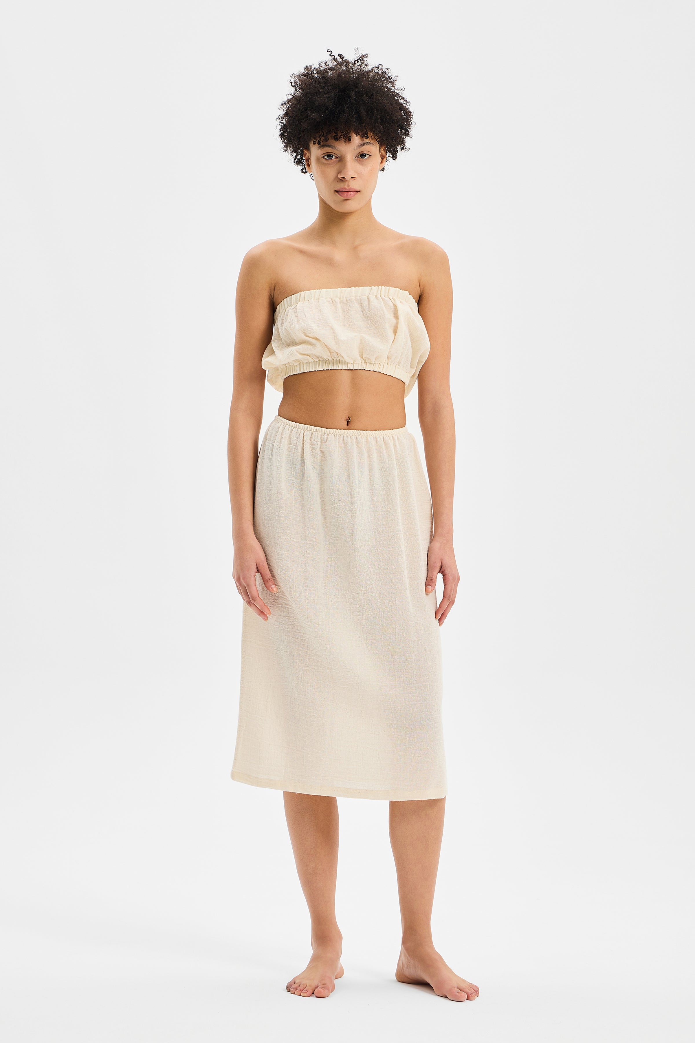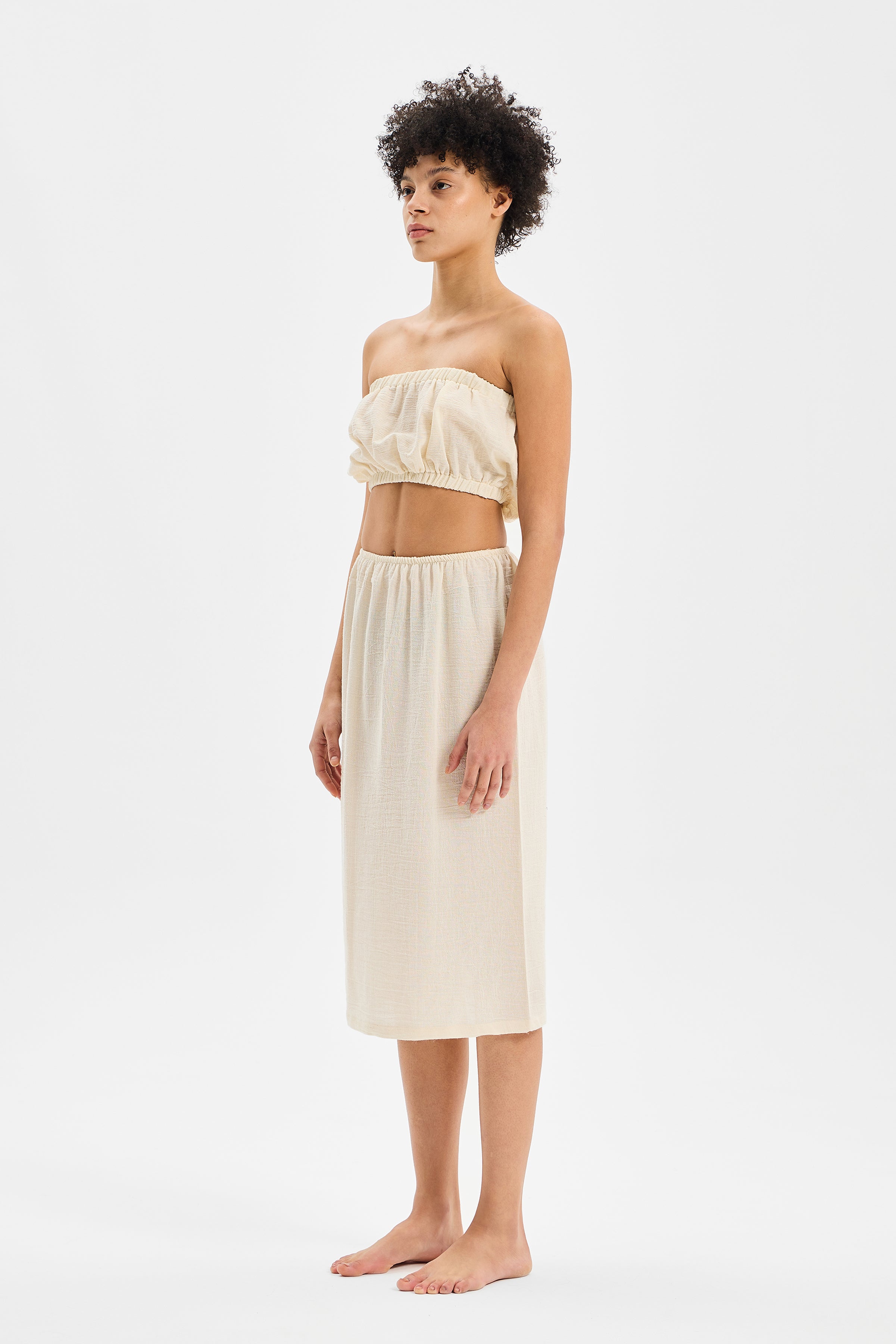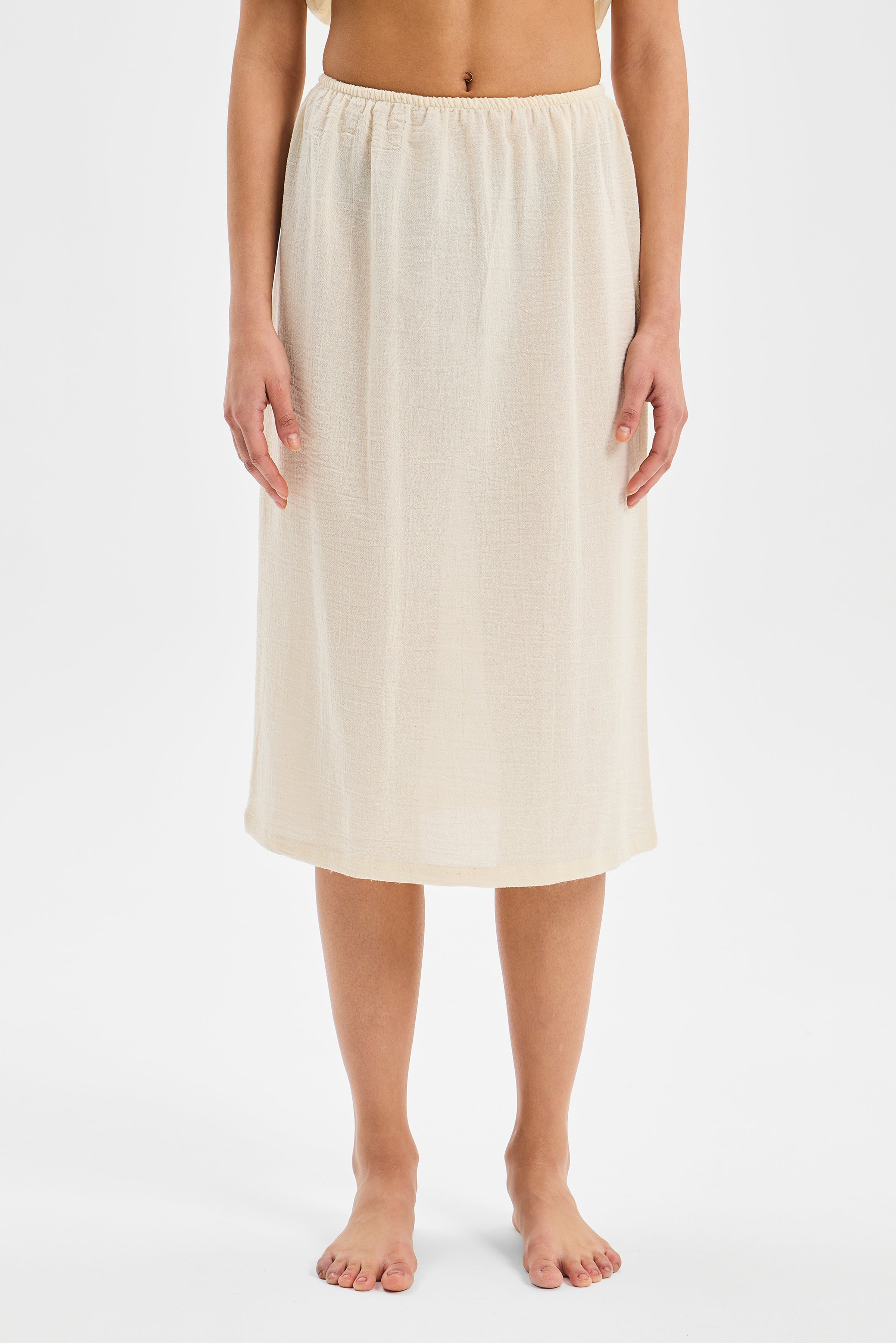 CORE FLOW, CORE ailesinin uzun formda devam eden temel alt astarıdır. Diz altına uzanan boyu ve düz, kesintisiz siluetiyle üst katmanların altında görünmeden konumlanır; bedeni sarmadan çevreler ve genel formun akışını dengeler. Bel hattındaki esnek yapı, astarın bedene doğal biçimde uyumlanmasını sağlarken hareket özgürlüğünü korur. Uzun boy oranı sayesinde elbise, kimono ve tunik gibi parçaların altında silueti uzatır; üst formun çizgisini bozmadan destekler ve sadeleştirir.