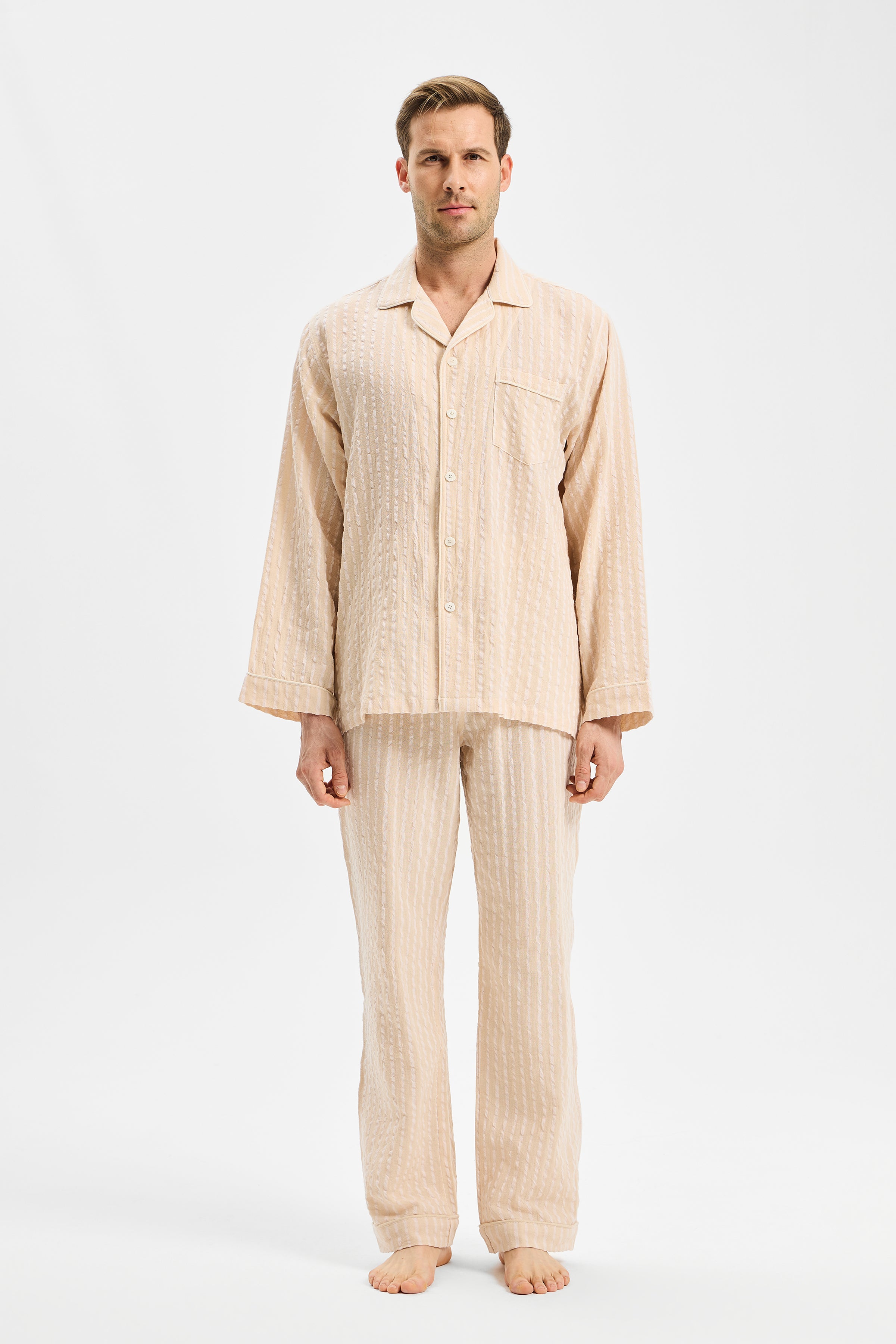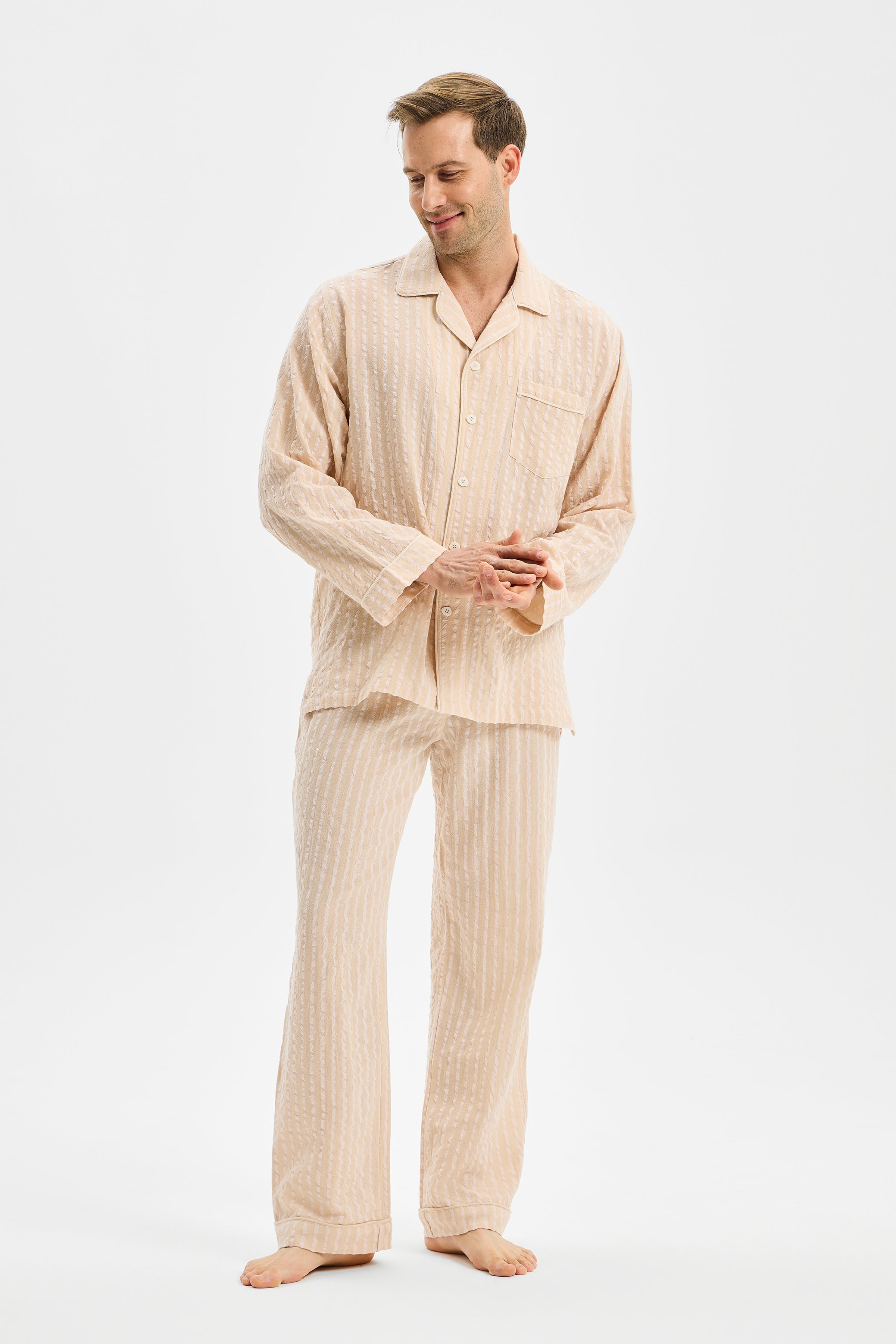 REST, klasik erkek pijama formundan uzaklaşarak yalın ve dengeli bir dinlenme seti anlayışıyla tasarlanmıştır. Üst parçada düz kesim ve rahat kol yapısı ölçülü bir özgürlük sunarken; alt parça bedeni sıkıştırmadan düşen net hatlarıyla gün boyu konforlu bir akış sağlar. Parçalar arasındaki oran ve denge, hareket alanını korur fakat siluetin dağılmasına izin vermez.