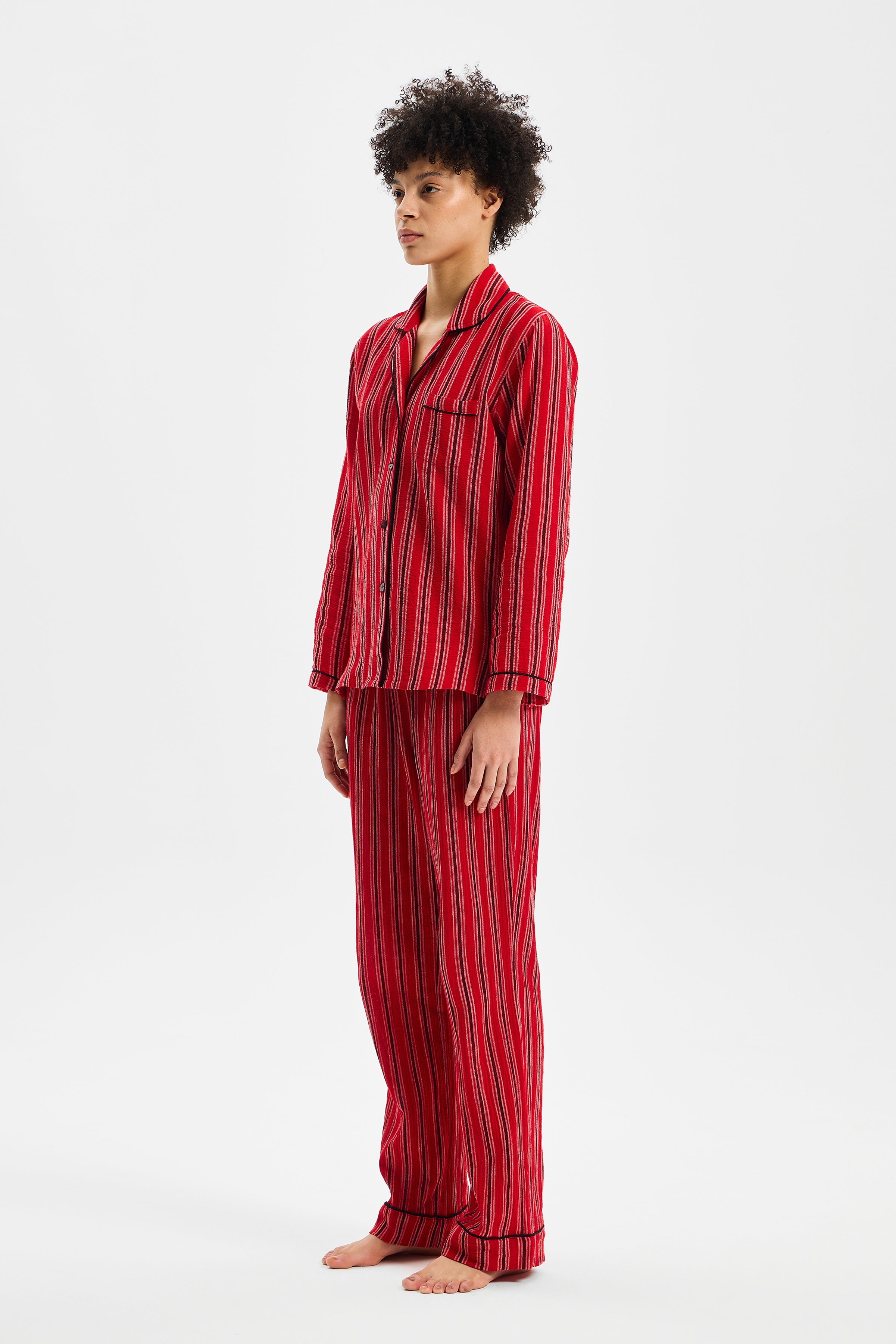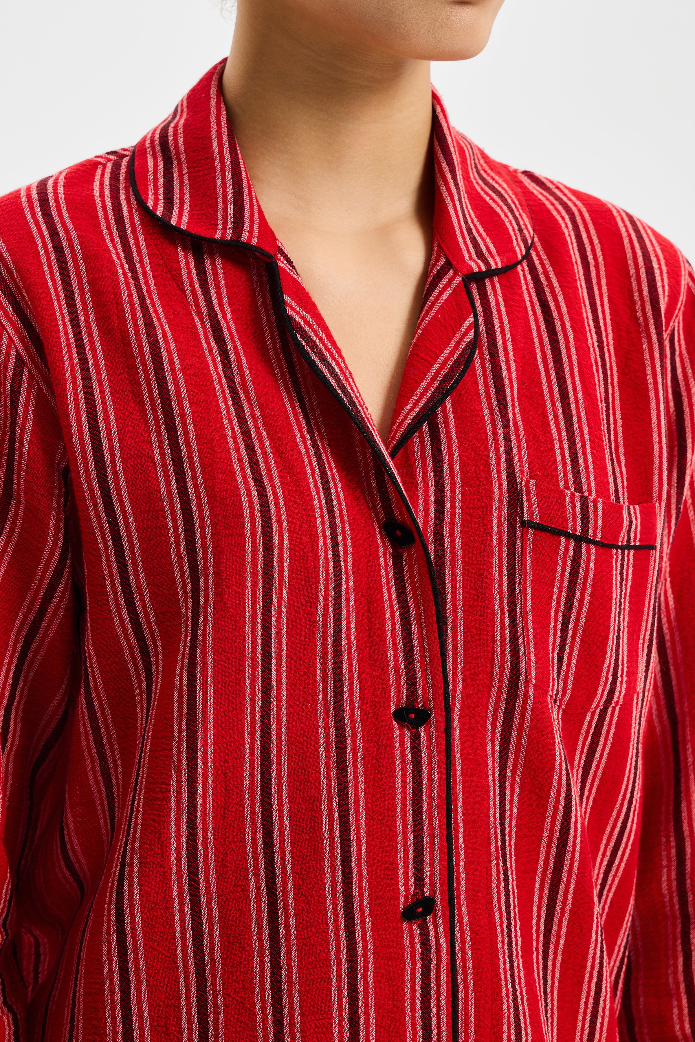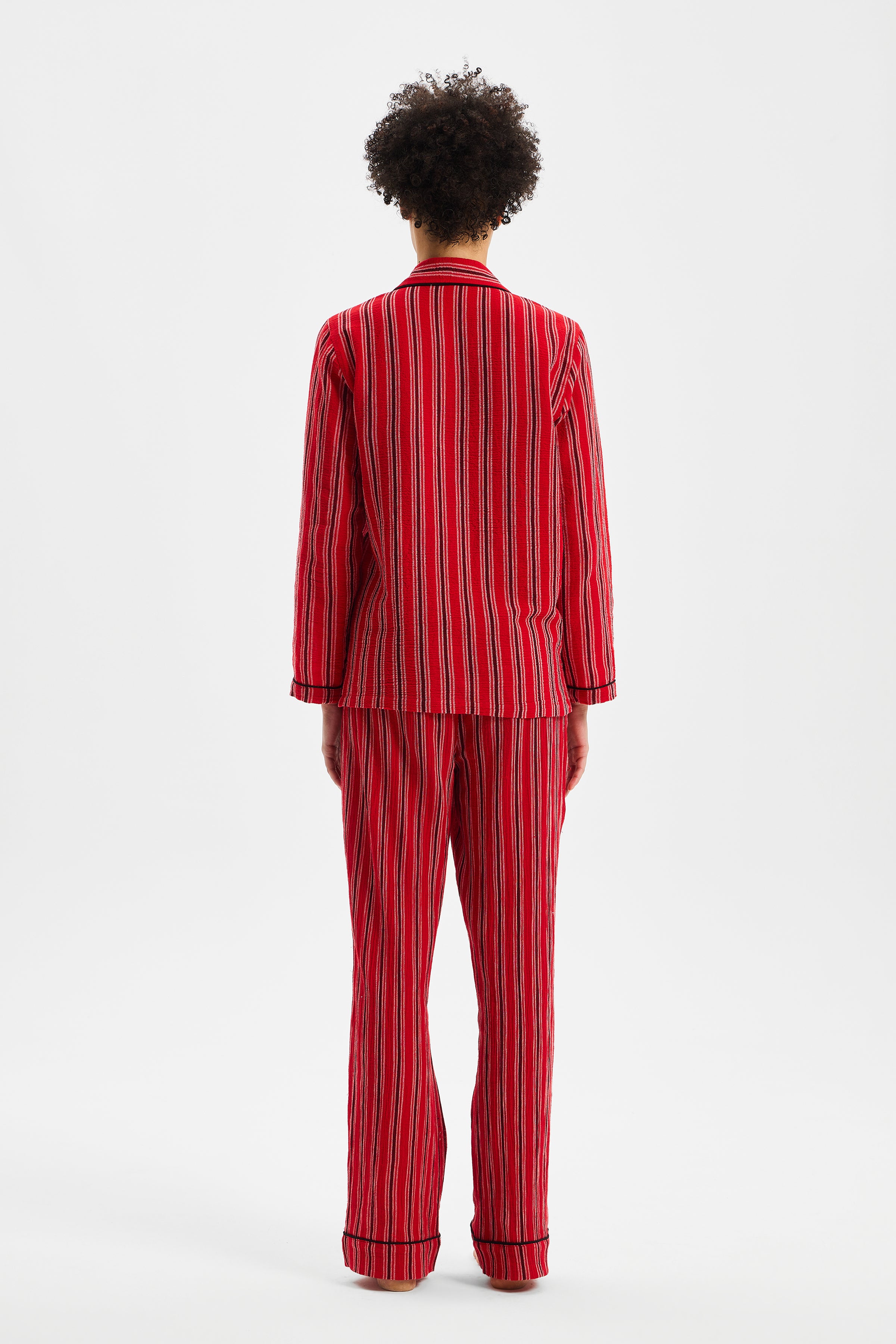 RITMO, çizgisel yüzeyi ve yumuşak düşüşüyle dinlenme anlarına ritmik bir denge kazandıran zamansız bir set olarak tasarlanmıştır. Gömlek formundaki üst parça ölçülü bir rahatlık sunarken; belden esnek alt parça bedeni sıkıştırmadan doğal bir akışla hareket eder. Parçalar arasındaki oran, silueti serbest bırakır fakat dağılmasına izin vermez.