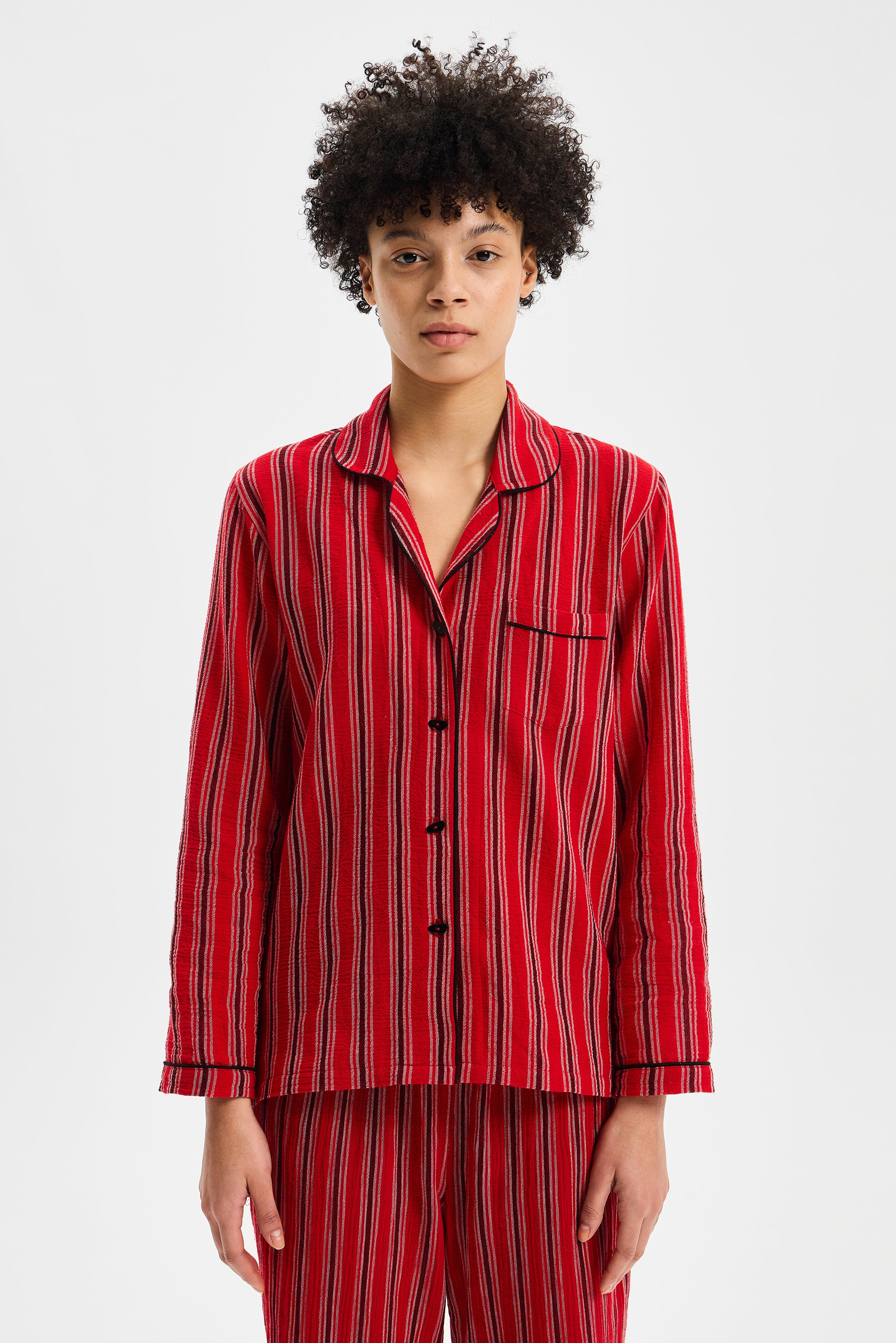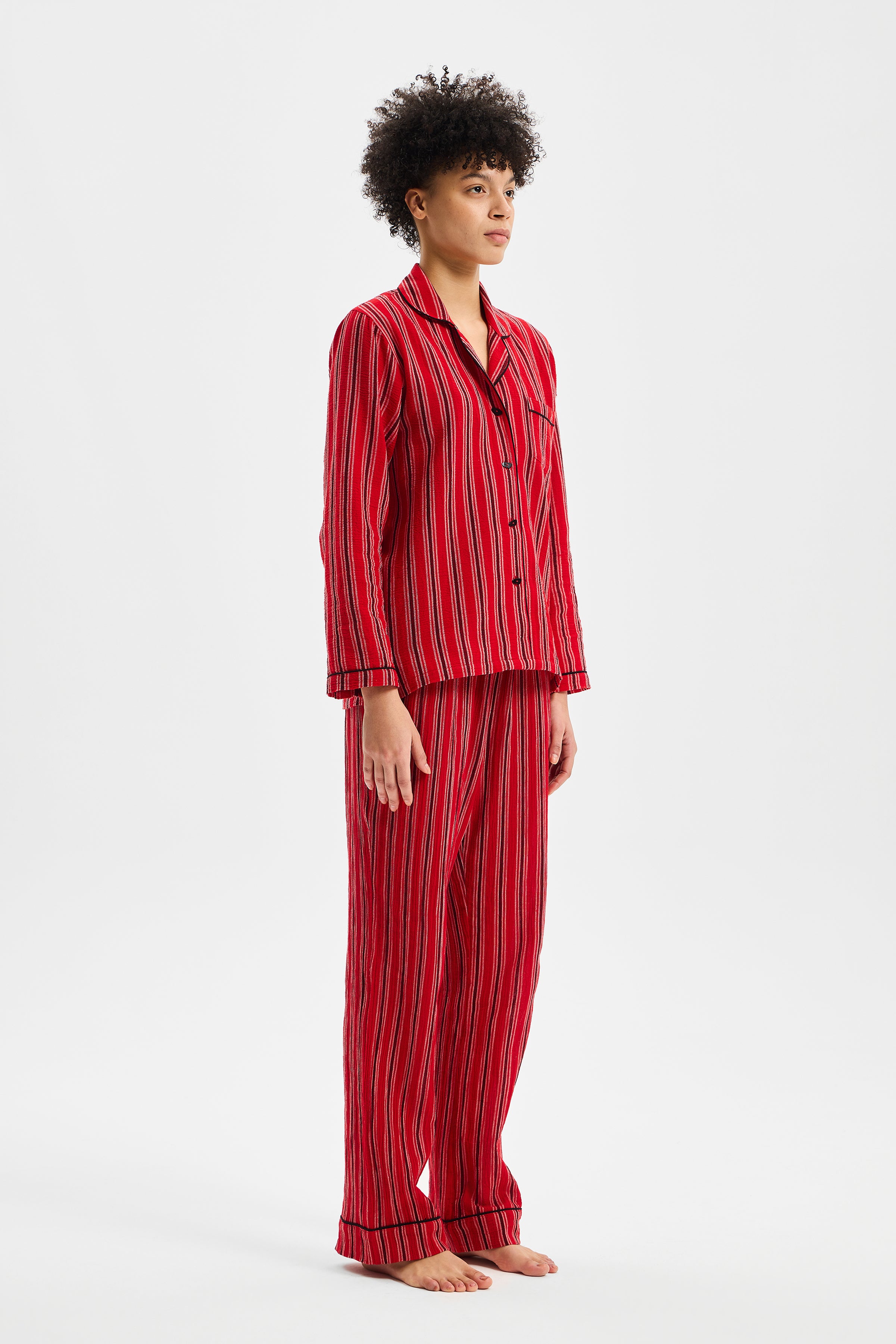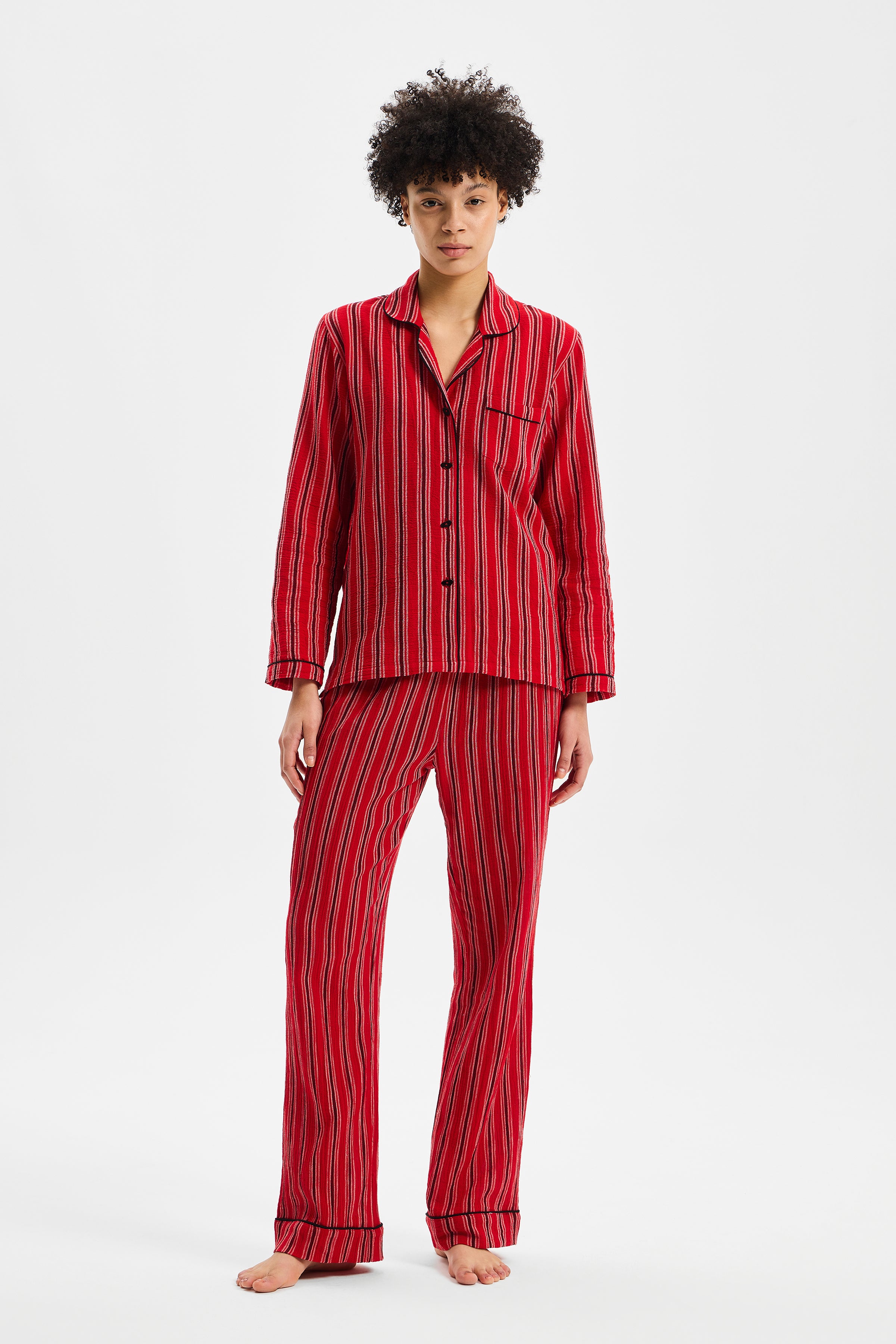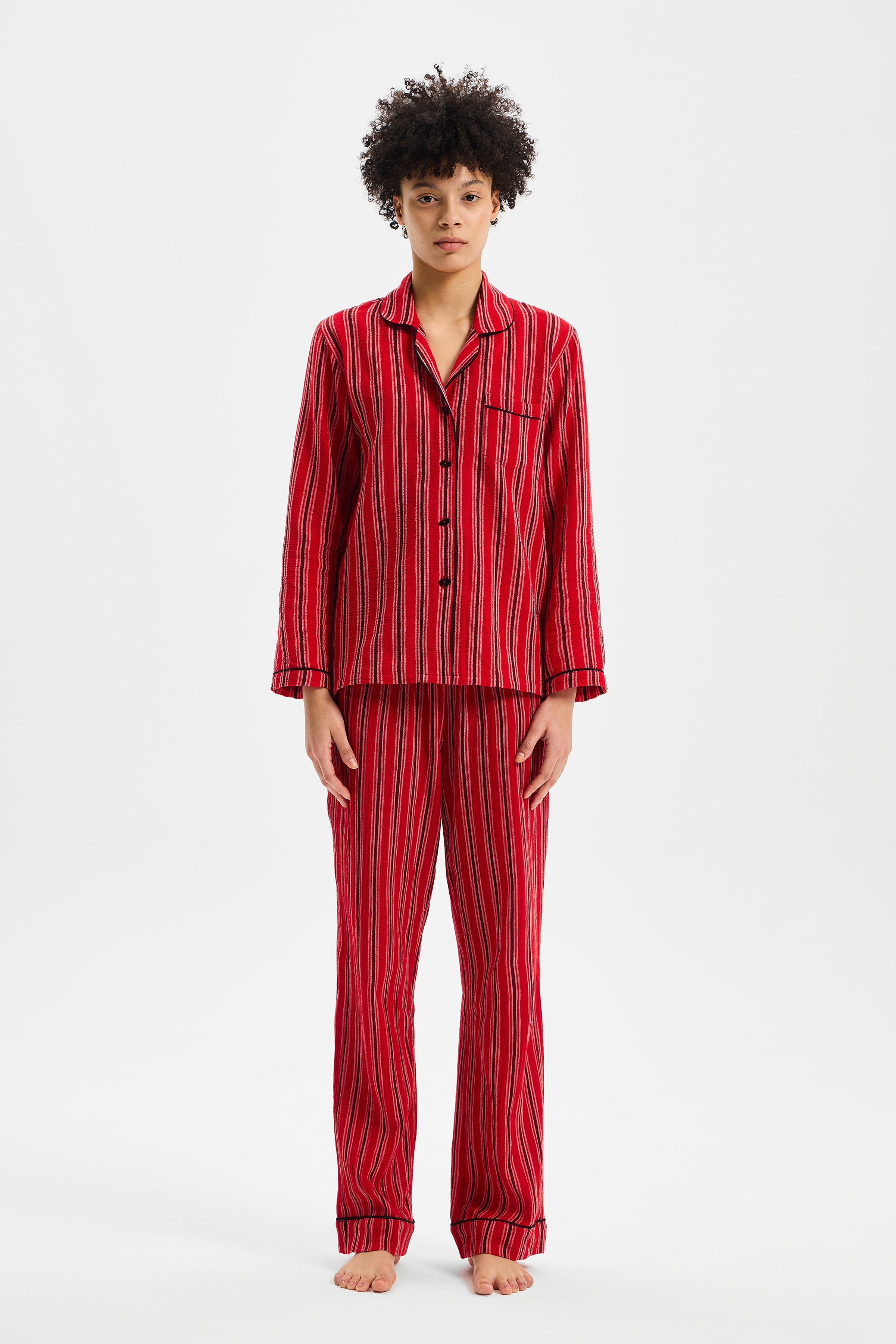 RITMO, çizgisel yüzeyi ve yumuşak düşüşüyle dinlenme anlarına ritmik bir denge kazandıran zamansız bir set olarak tasarlanmıştır. Gömlek formundaki üst parça ölçülü bir rahatlık sunarken; belden esnek alt parça bedeni sıkıştırmadan doğal bir akışla hareket eder. Parçalar arasındaki oran, silueti serbest bırakır fakat dağılmasına izin vermez.